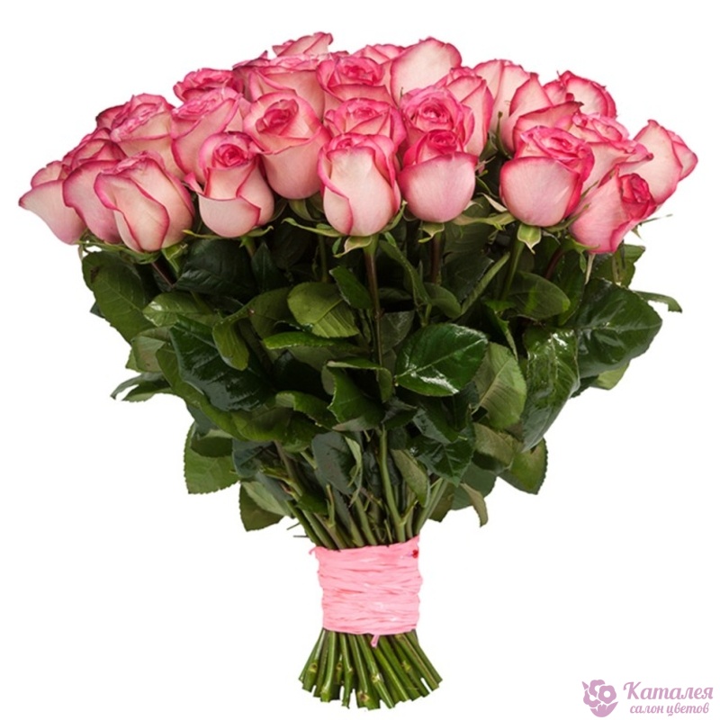 Букет состоит из 35 розовых роз, прозрачная упаковка, атласная лента.