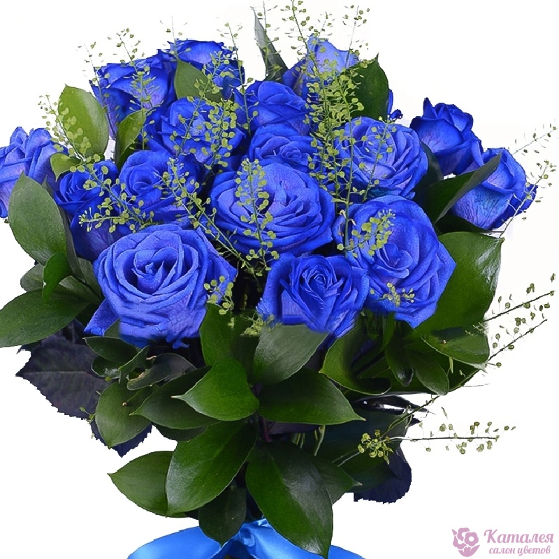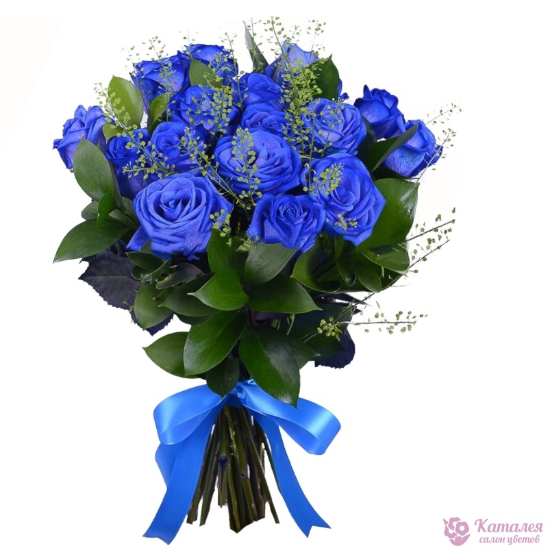 Букет состоит из 17 синих роз, зелень, прозрачная упаковка, атласная лента.