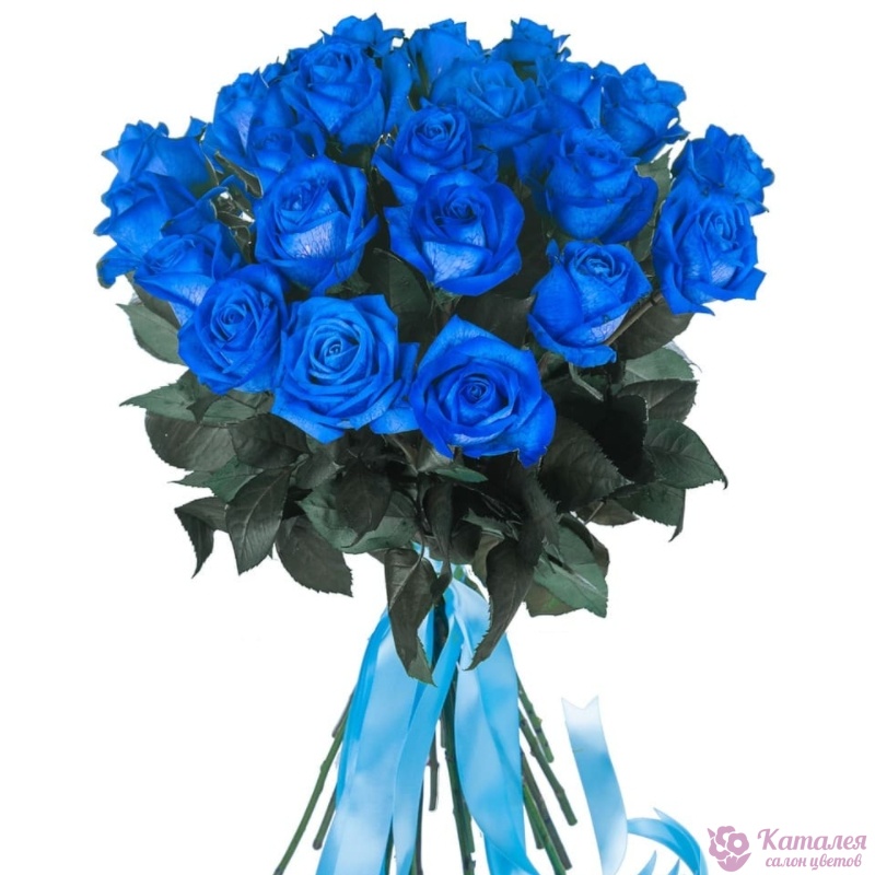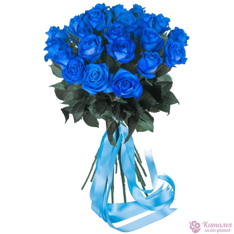 Букет состоит из 23 синие розы, прозрачная упаковка, атласная лента.