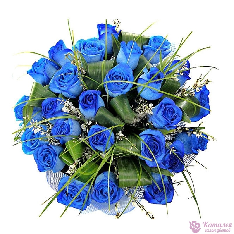 Букет состоит из 25 синих роз, аспидистра, зелень, красивая упаковка, атласная лента.