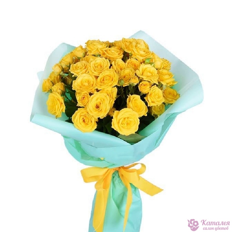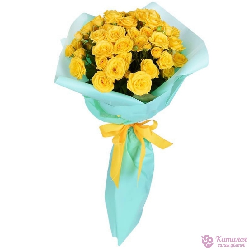 Букет состоит из 15 желтых кустовых роз, красивая упаковка, атласная лента.