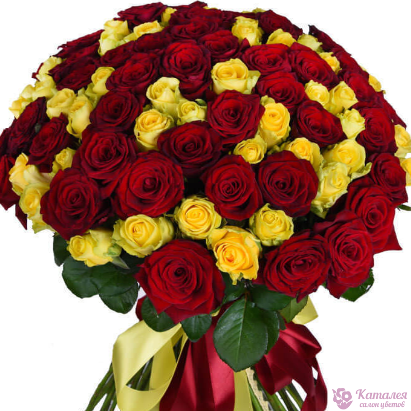 Букет состоит из 26 красных роз, 25 желтых роз, прозрачная упаковка, атласная лента.
