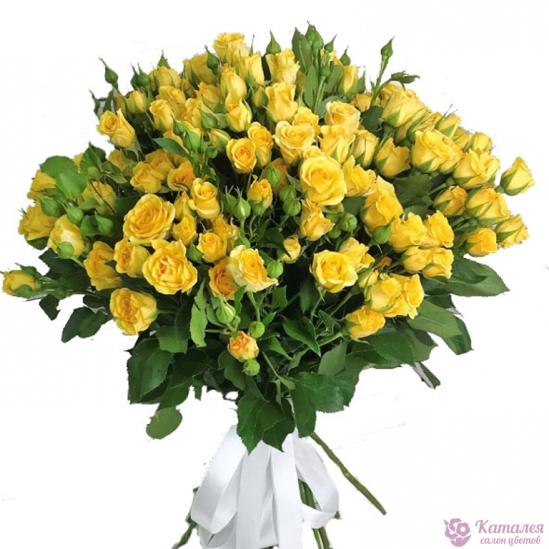 Букет состоит из 27 желтых кустовых роз, прозрачная упаковка, атласная лента.