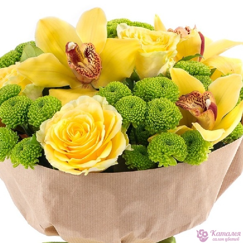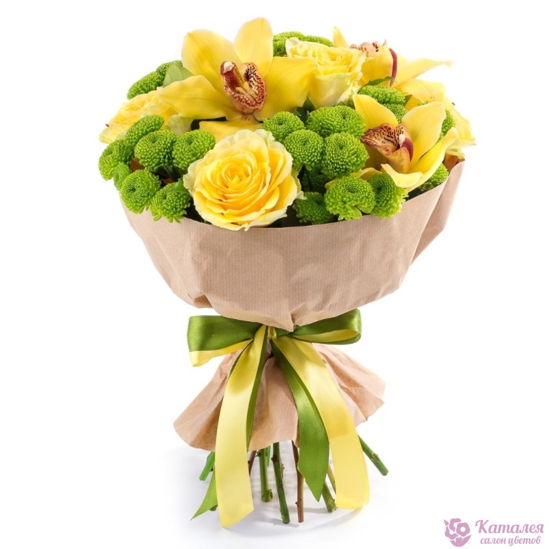 Букет состоит из 4 желтые розы, 3 орхидеи, 6 хризантем Сантини, крафт, атласная лента.