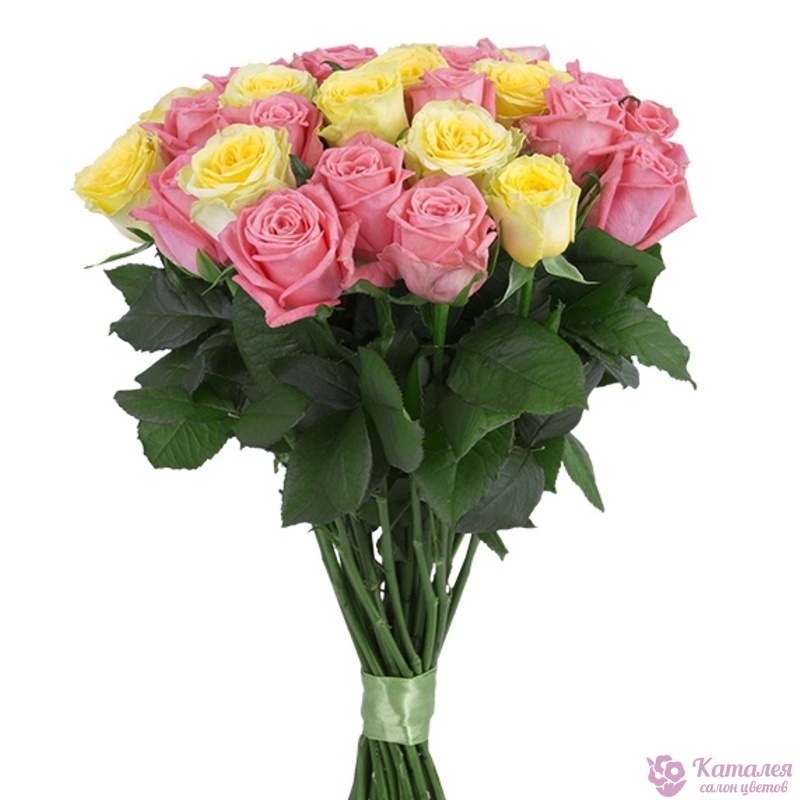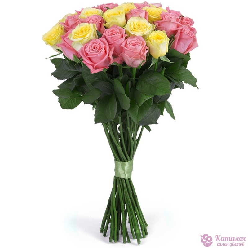 Букет состоит из 20 розовых роз, 11 желтых роз, прозрачная упаковка, атласная лента.