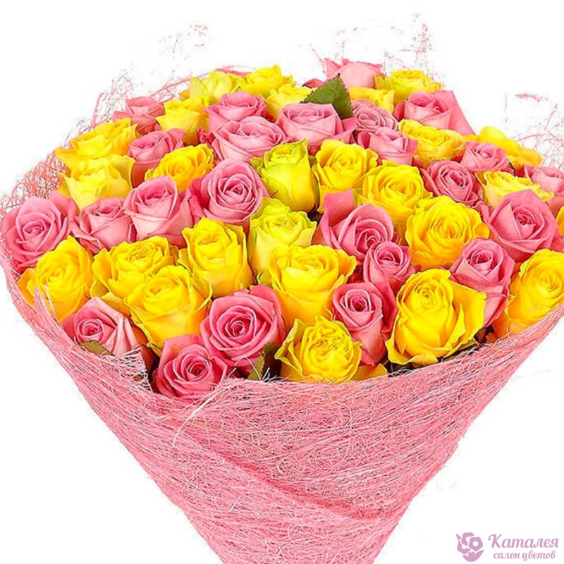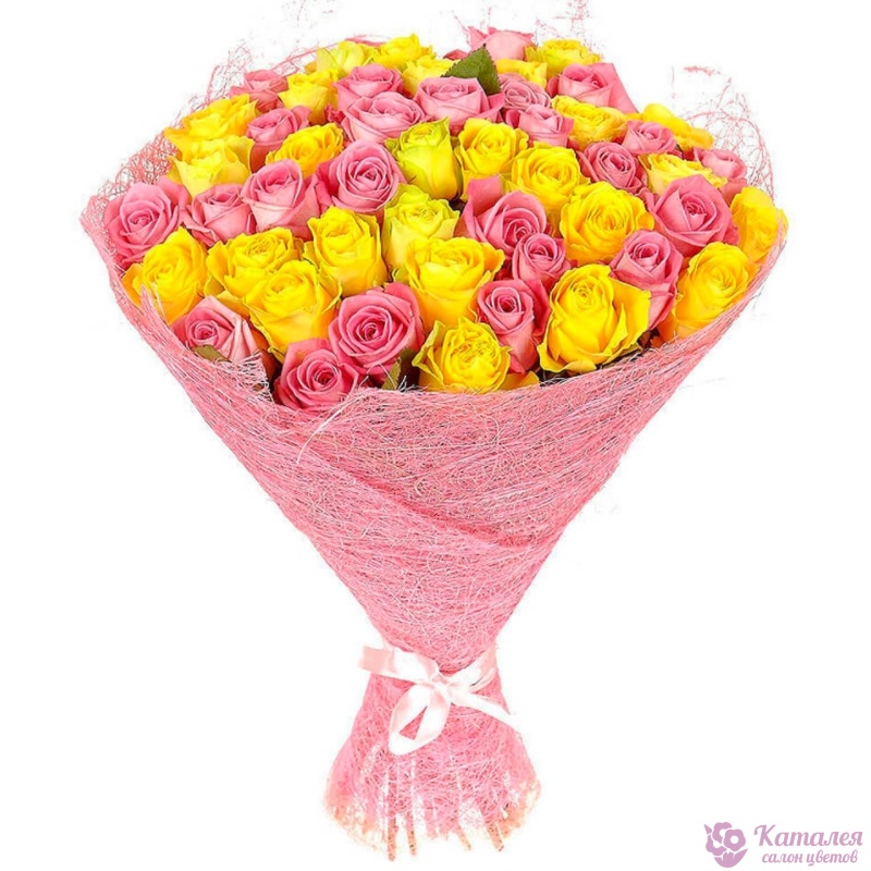 Букет состоит из 23 розовые розы, 22 желтые розы, красивая упаковка, атласная лента.