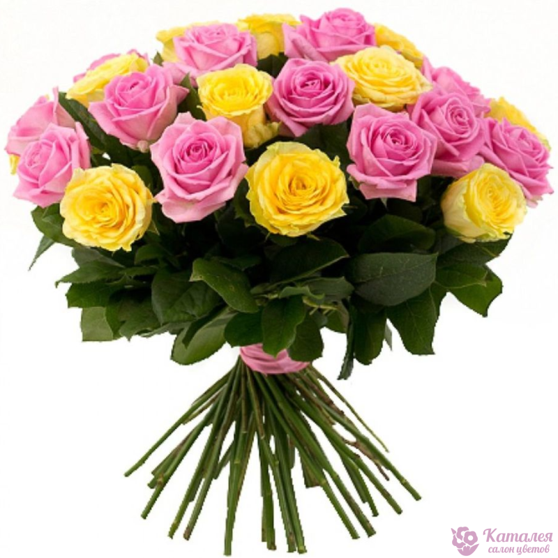 Букет состоит из 23 розовые розы, 22 желтые розы, прозрачная упаковка, атласная лента.