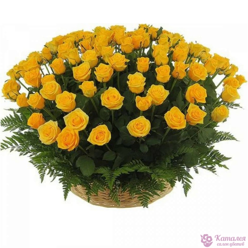 101 желтая роза, папоротник, корзина.