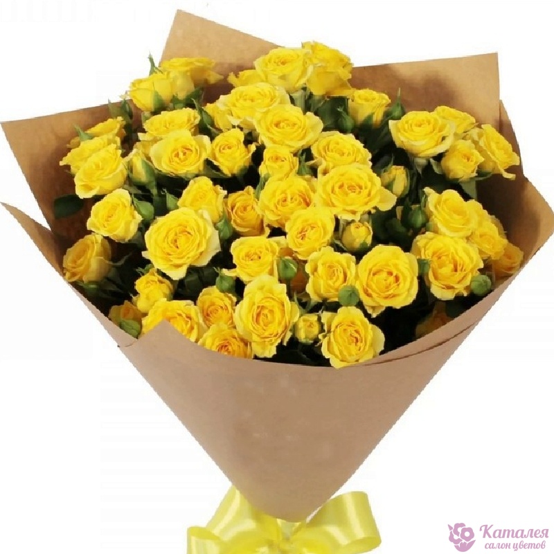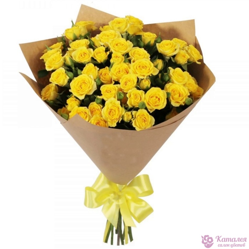 Букет состоит из 11 желтых кустовых роз, крафт, атласная лента.