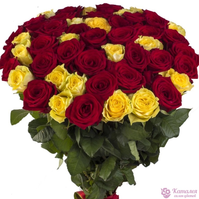 Букет состоит из 23 бордовые розы, 22 желтые розы, прозрачная упаковка, атласная лента.