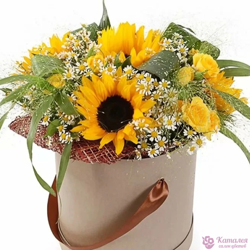 Букет из подсолнухов и роз в коробке