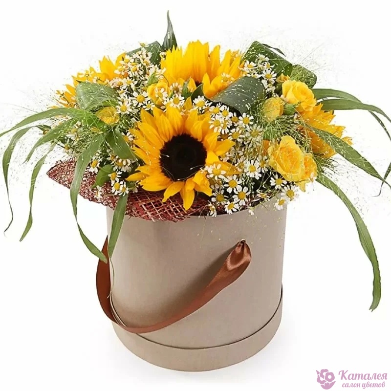 Букет состоит из 5 подсолнухов, 2 желтые кустовые розы, 10 веток танацетума, аспидистра, зелень, коробка, оазис.