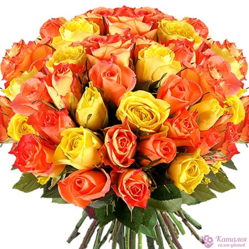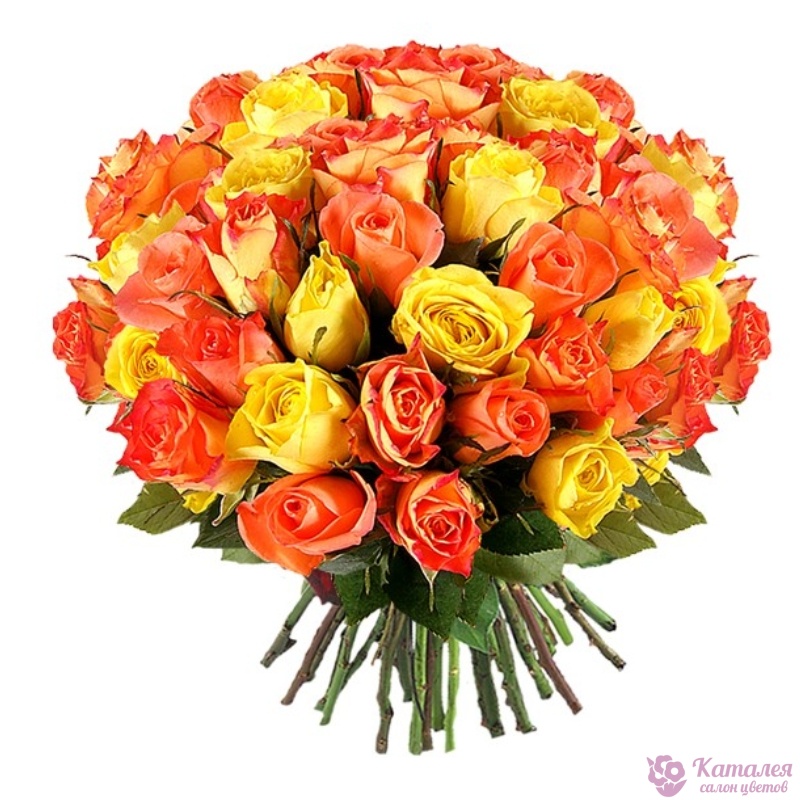 Букет состоит из 30 оранжевых роз, 15 желтых роз, прозрачная упаковка, атласная лента.