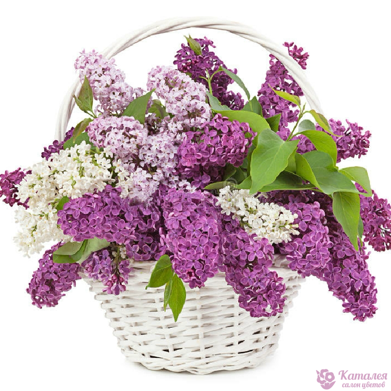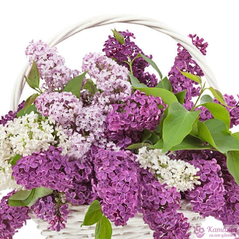 Букет состоит из 15 веток сирени, оазис, корзина.