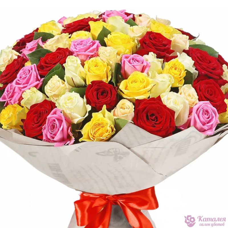 Букет состоит из MIX из 101 желтой / красной / белой / розовой розы, красивая упаковка, лента.