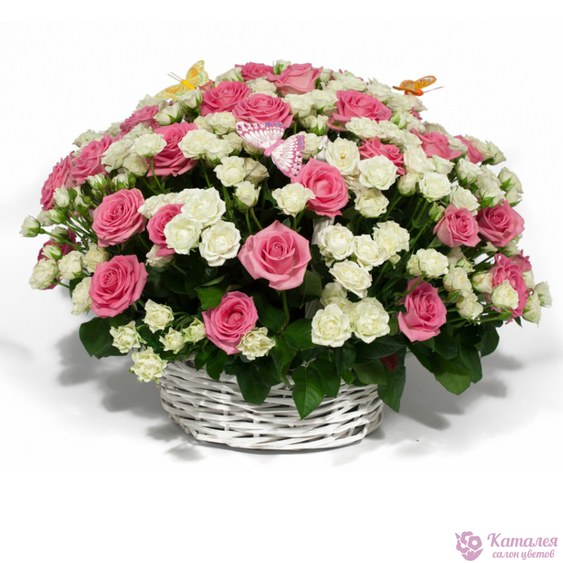 Букет состоит из 29 розовых роз, 26 белых кустовых роз, корзина.