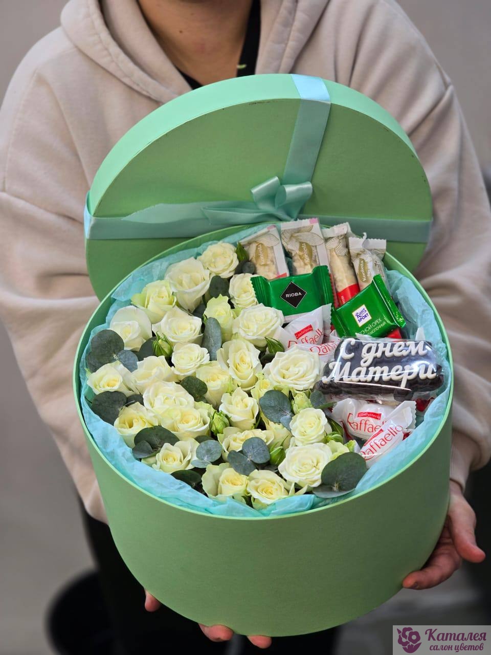 Круглая коробка с конфетами и цветами для Мамочки