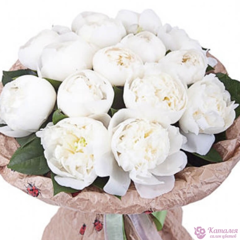 Букет состоит из 15 белых пионов, крафт, атласная лента.