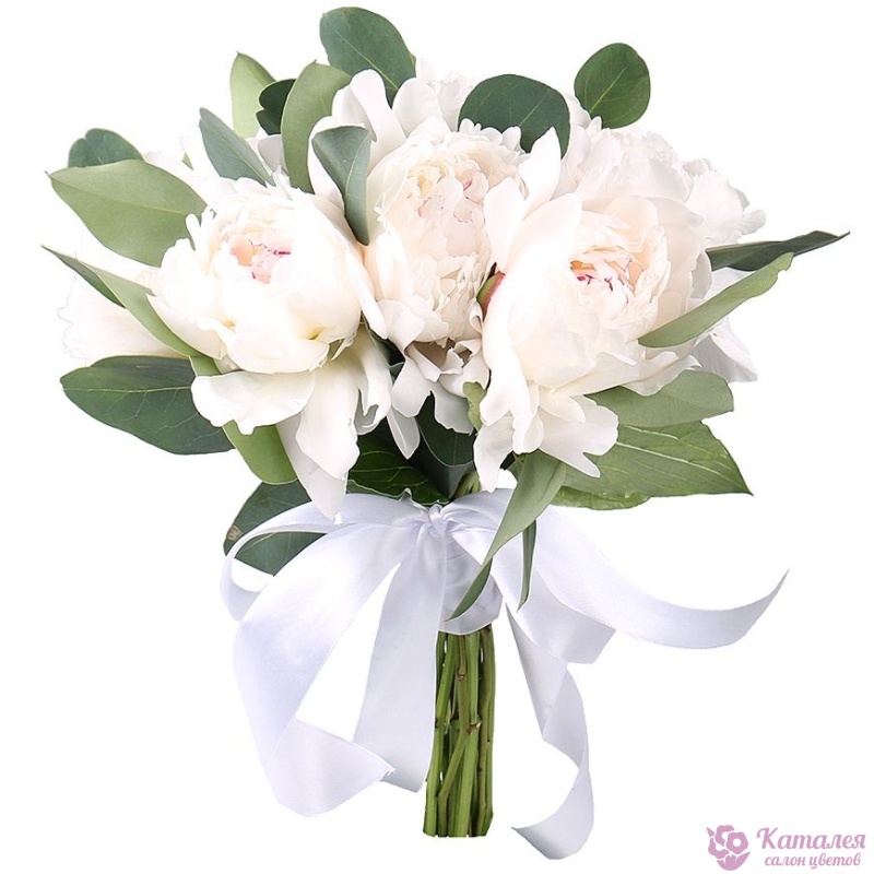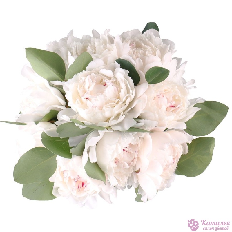 Букет состоит из 9 белых пионов, эвкалипт, прозрачная упаковка, атласная лента.