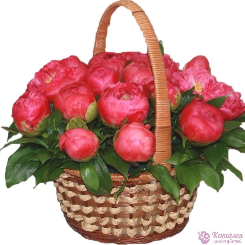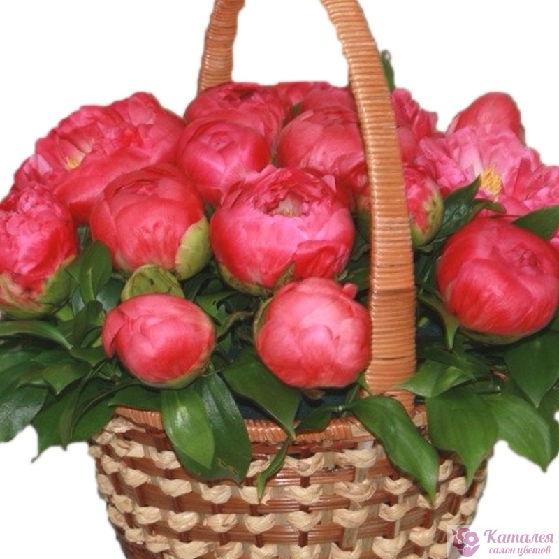 Букет состоит из 23 красных пионов, зелень, корзина, оазис.