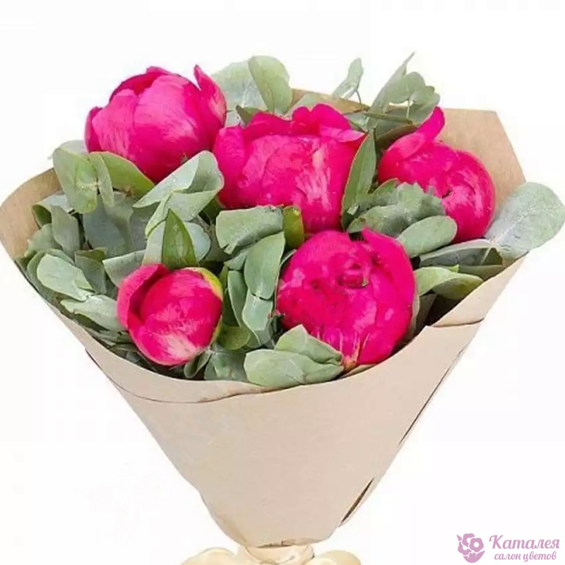 Букет состоит из 5 красных пионов, эвкалипт, крафт, атласная лента.
