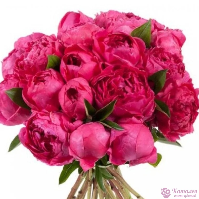 Букет состоит из 19 красных пионов, прозрачная упаковка, атласная лента.