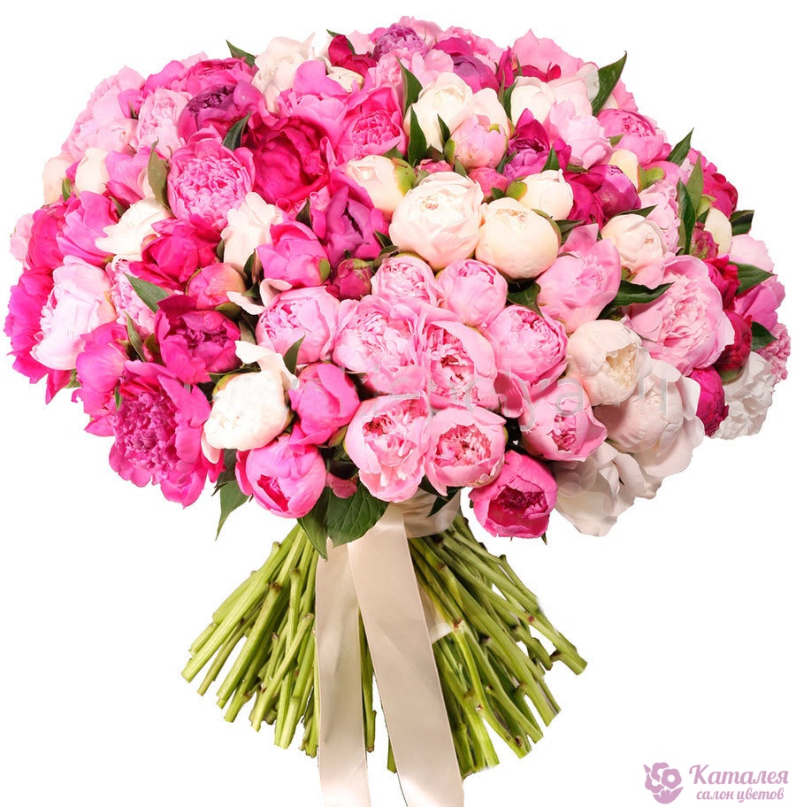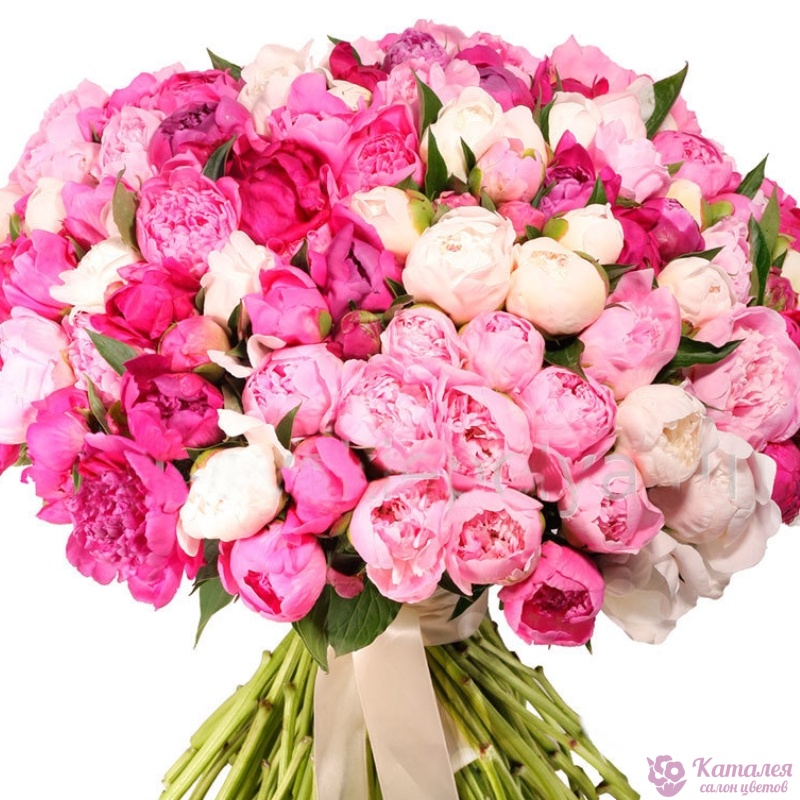 Букет состоит из 51 розовый пион, 50 белых пионов, прозрачная упаковка, атласная лента.