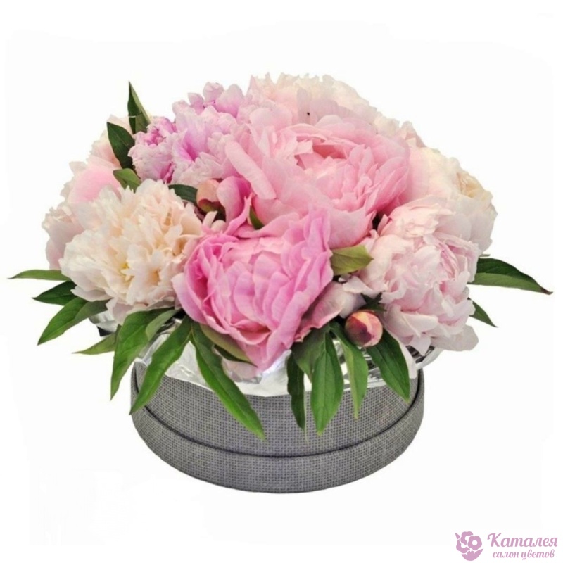 Букет состоит из 11 разноцветных пионов, зелень, коробка, оазис.