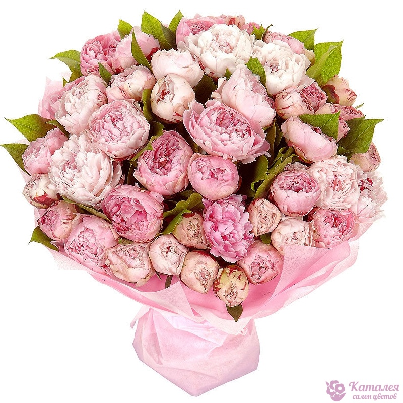 Букет состоит из 45 розовых пионов, зелень, красивая упаковка, атласная лента.