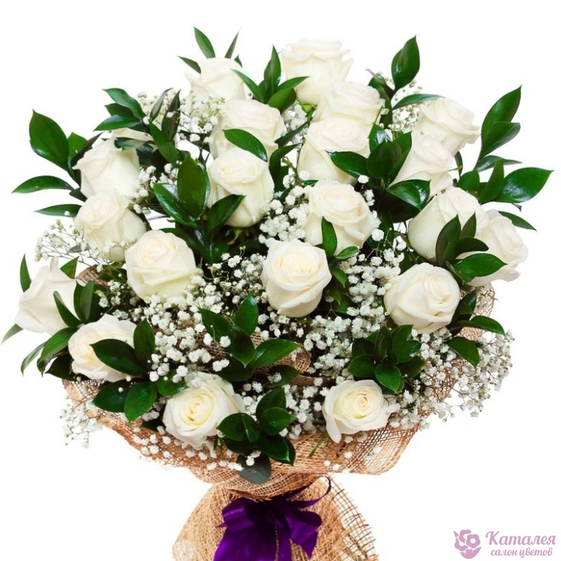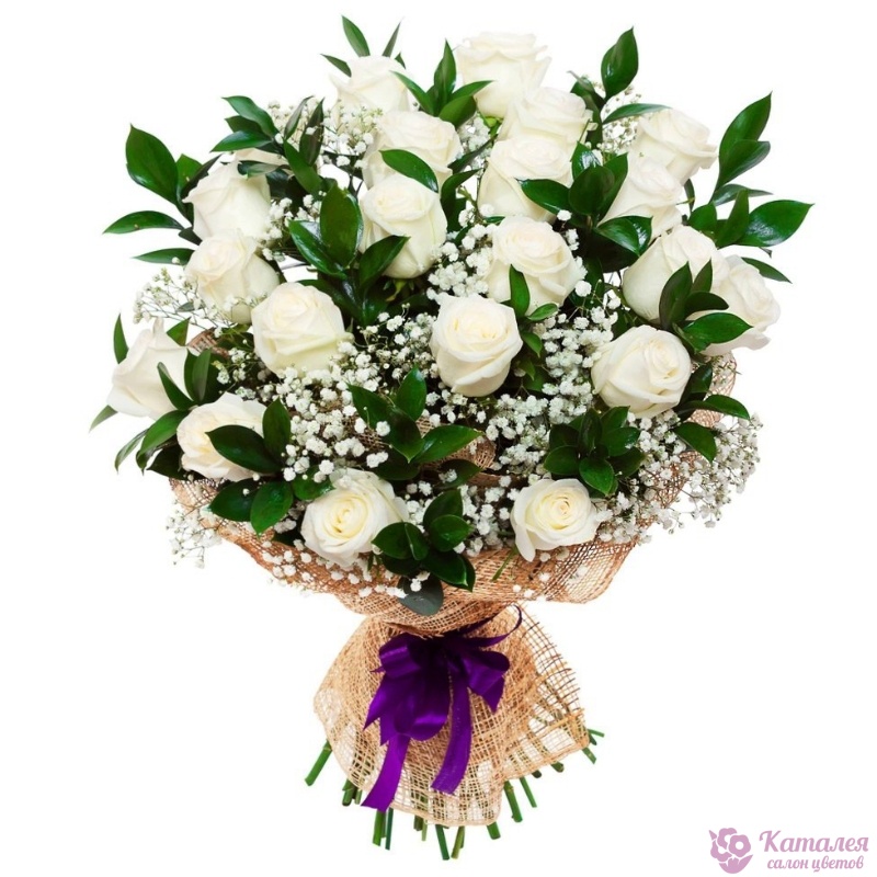 Букет состоит из 21 белая роза, 2 ветки гипсофилы, красивая упаковка, зелень.