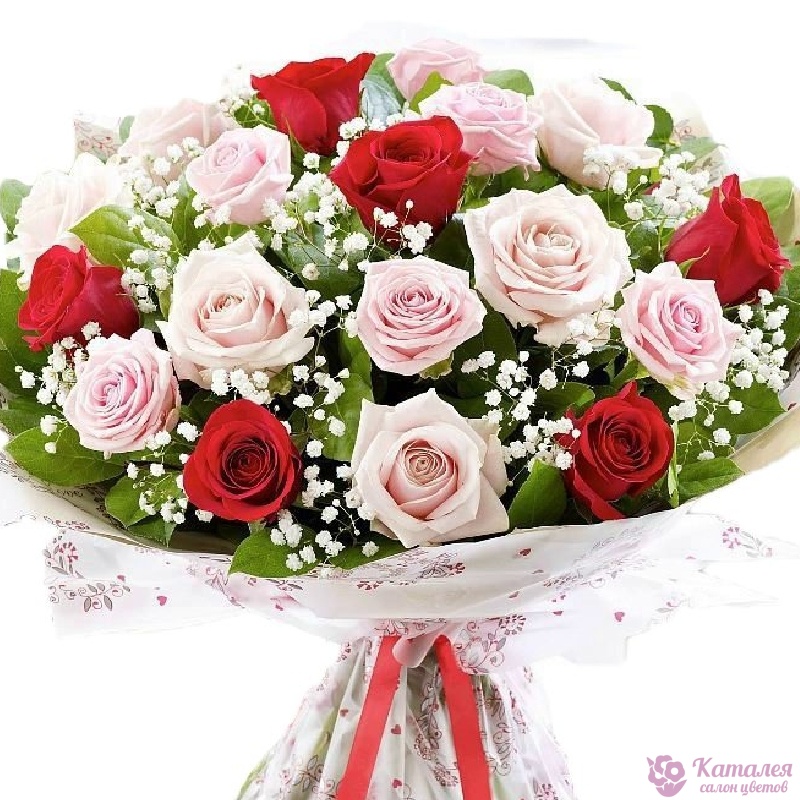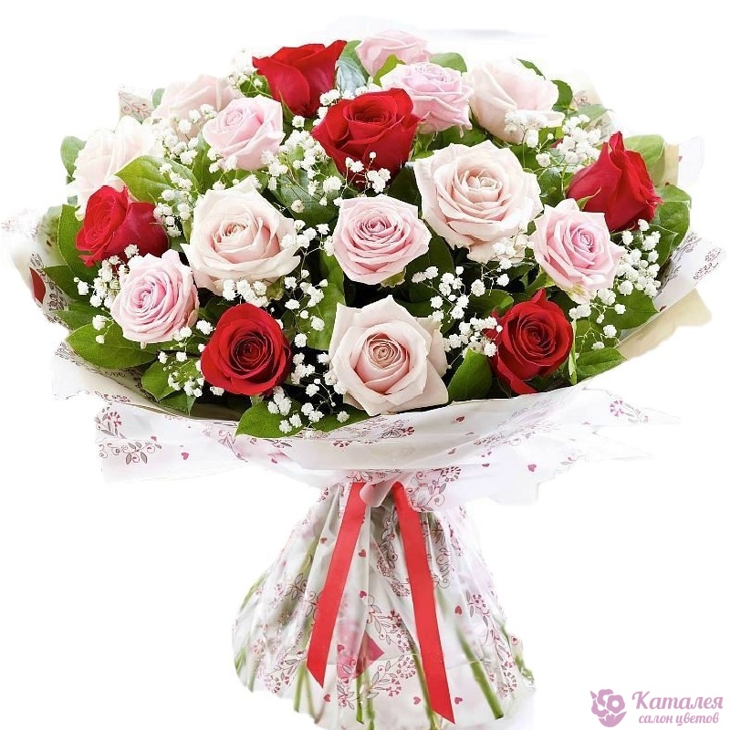 Букет состоит из 14 розовых роз, 7 красных роз, 2 ветки гипсофилы, красивая упаковка, атласная лента.