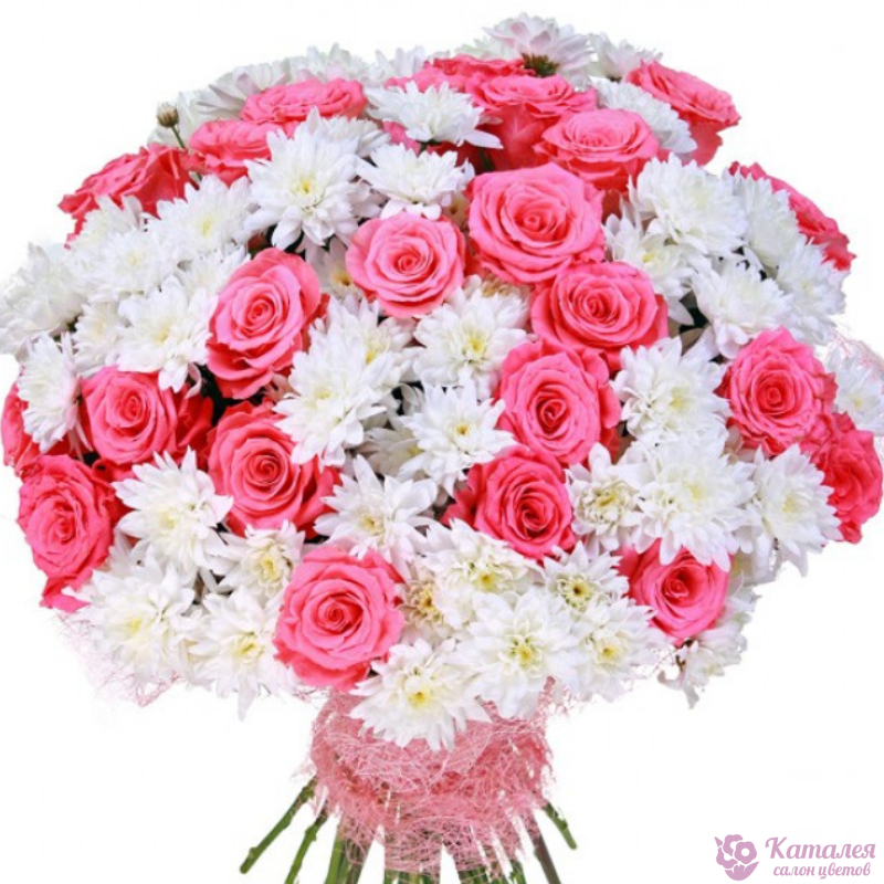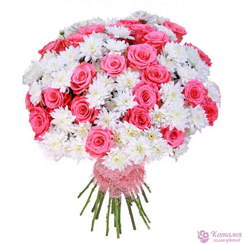 Букет состоит из 25 розовых роз, 24 ветки белой хризантемы, розовая упаковка, атласная лента.