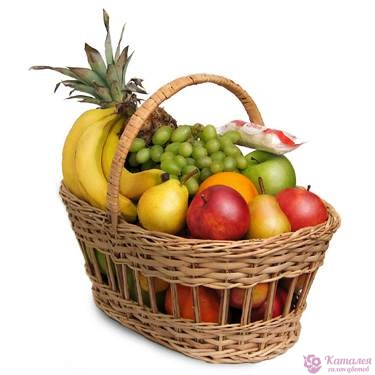 Большая корзина со свежими фруктами. В корзину входит яблоки 6 шт, груши 3 шт, виноград 1 шт, бананы 5 шт, киви 5 шт, апельсины 2 шт, ананас 1 шт, мандарины 5 шт.