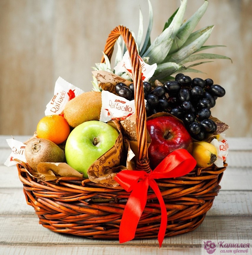 фруктовая композиция в корзине из винограда, бананов, яблок, мандарин, ананаса и конфет раффаэлло. 3,5 кг.