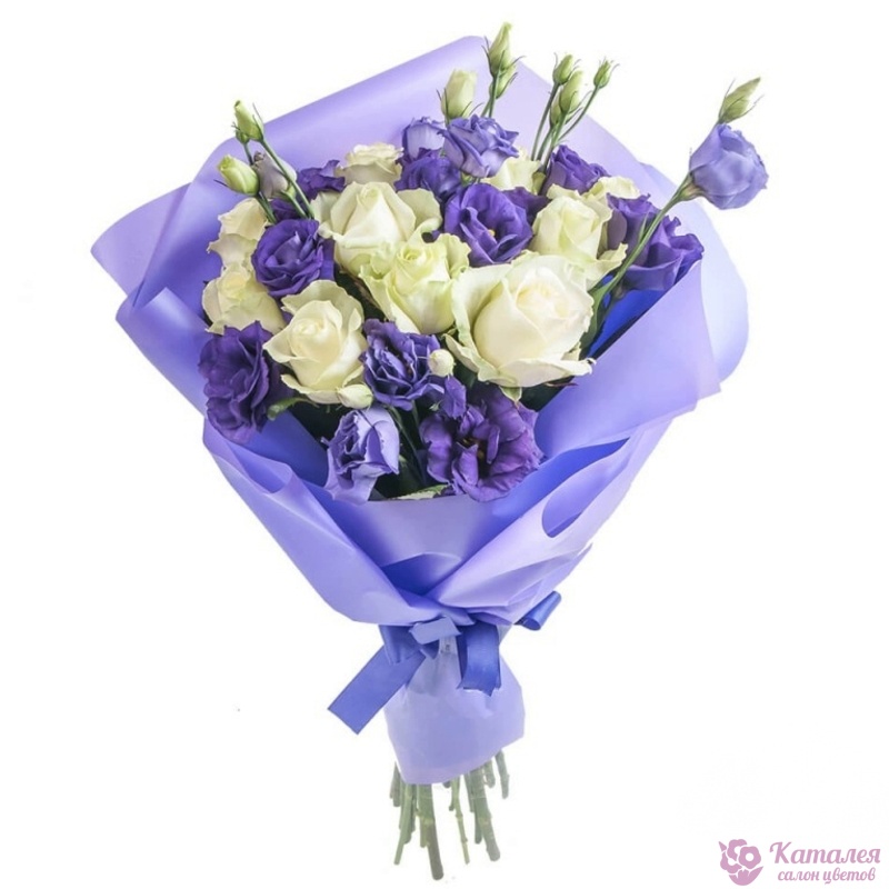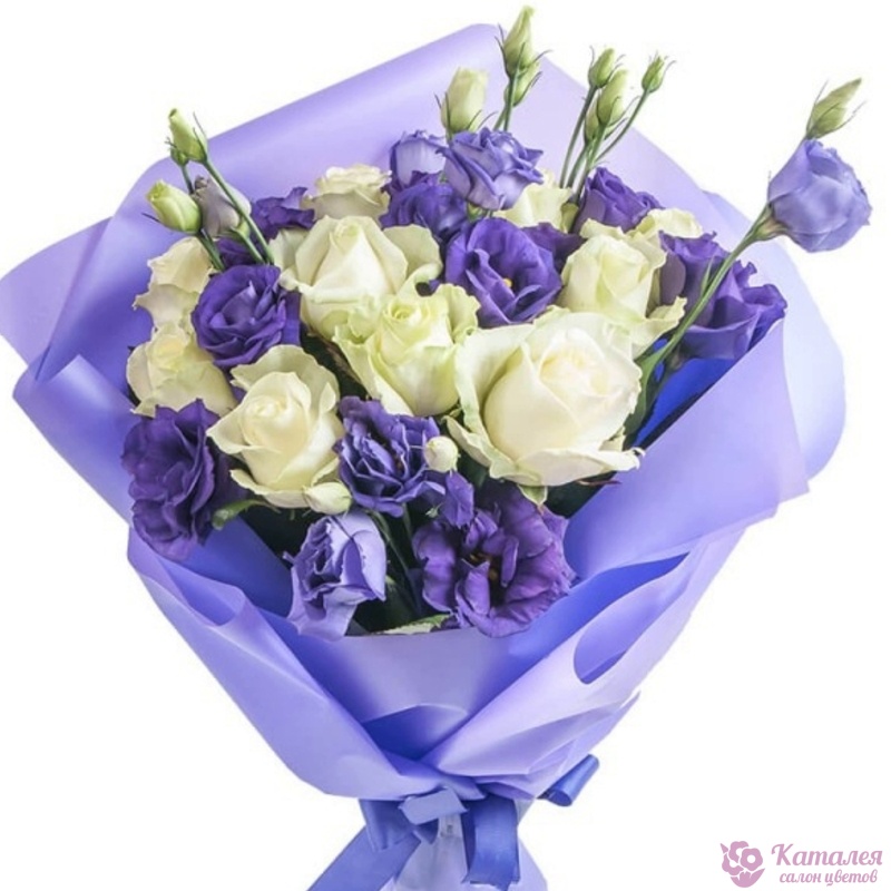 Букет состоит из 9 белых роз, 4 ветки эустомы, красивая упаковка, атласная лента.