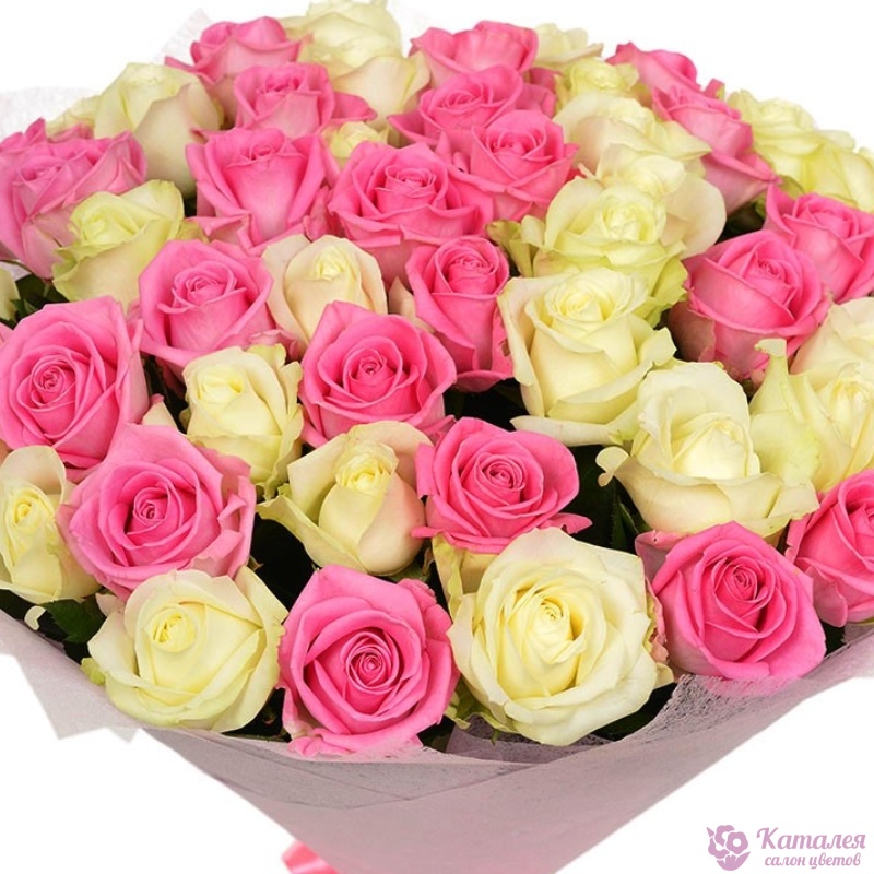 Букет состоит из 26 белых роз, 25 розовых роз, красивая упаковка, атласная лента.