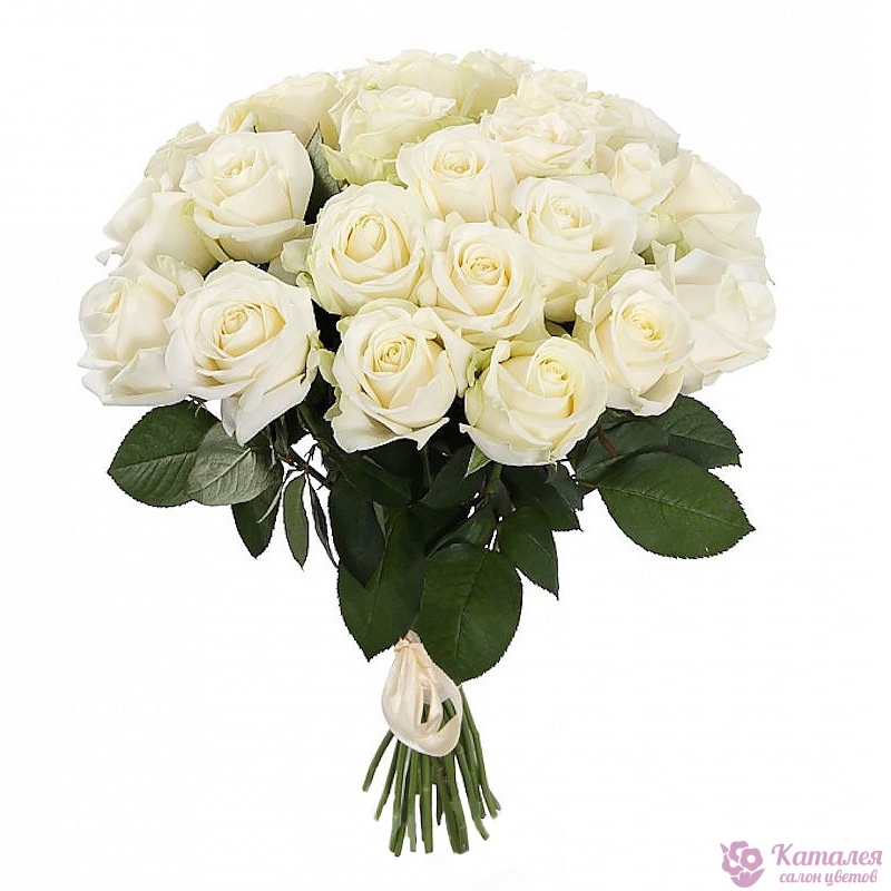 Букет состоит из 31 белая роза, прозрачная упаковка, атласная лента.