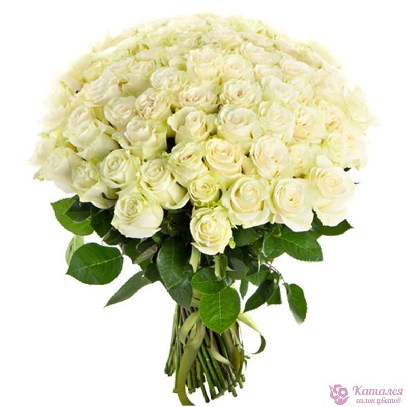 Букет состоит из 75 белых роз, прозрачная упаковка, белая лента.