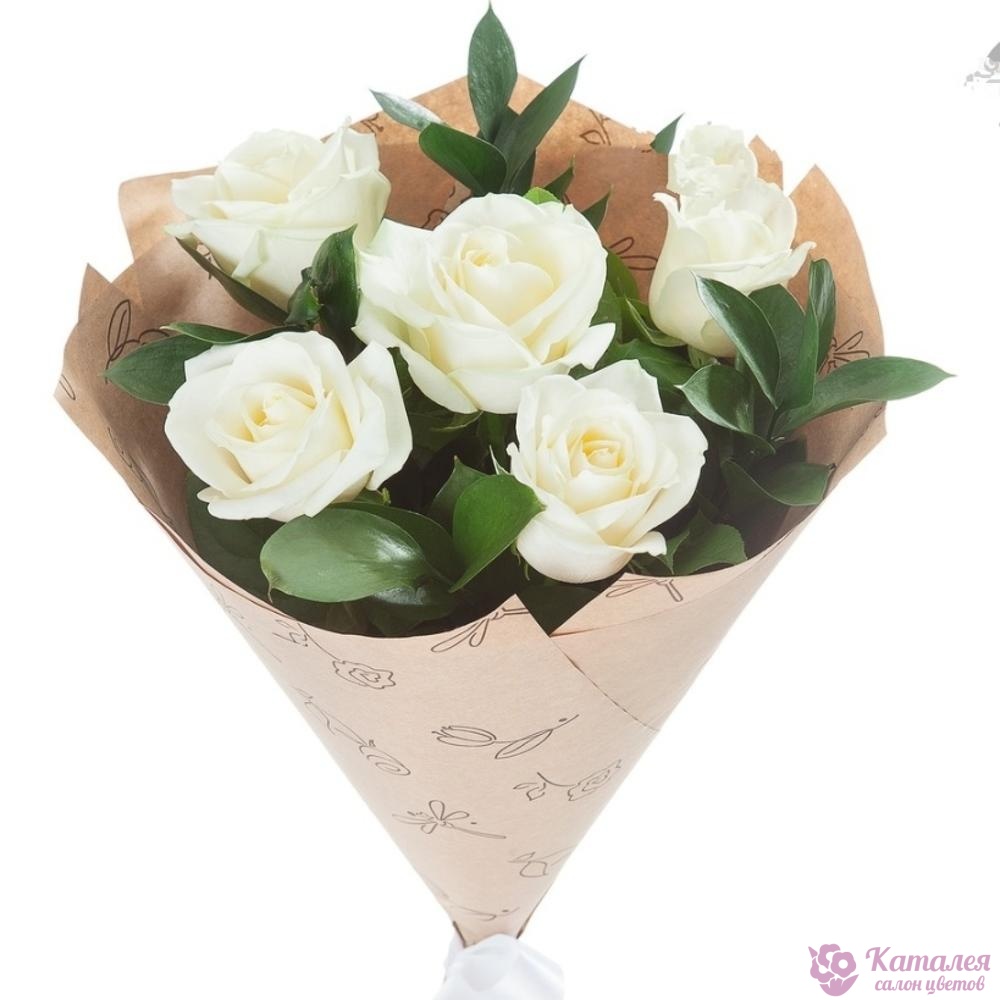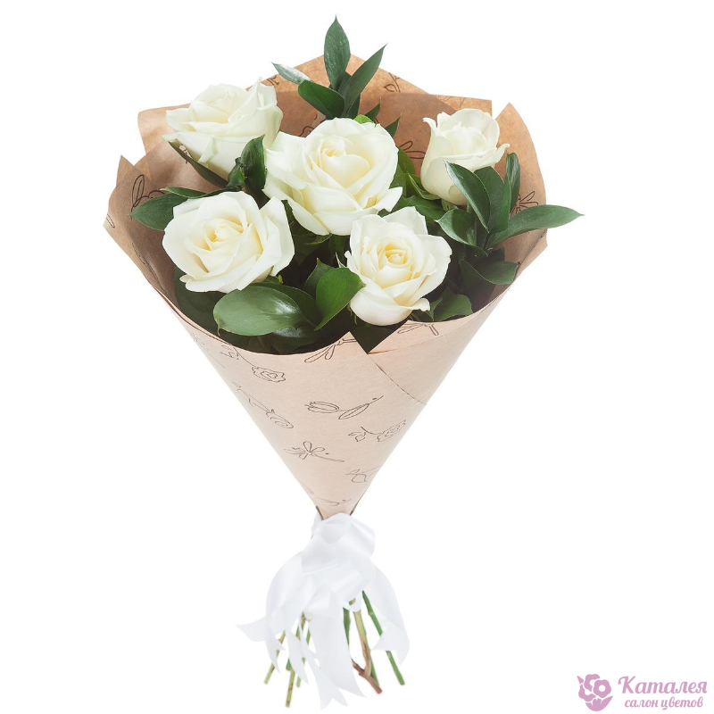 Букет состоит из 5 белых роз, зелень, крафт, атласная лента.