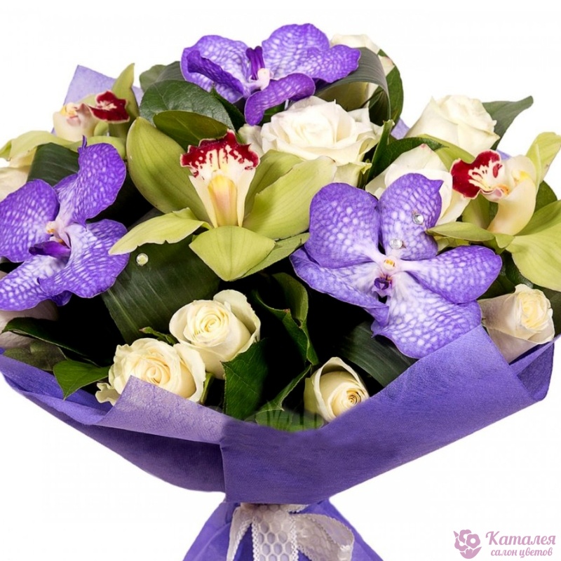 Букет состоит из 11 роз, 6 орхидей, зелень, красивая упаковка, атласная лента.