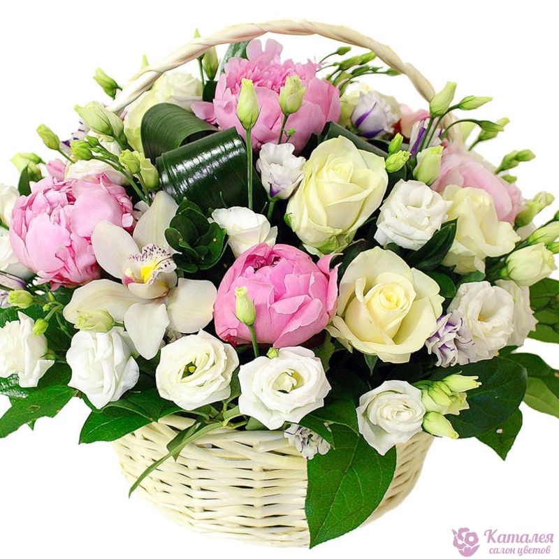 Букет состоит из 5 пионов, 7 роз, 2 орхидеи, 7 веток эустомы, зелень, корзина, оазис.