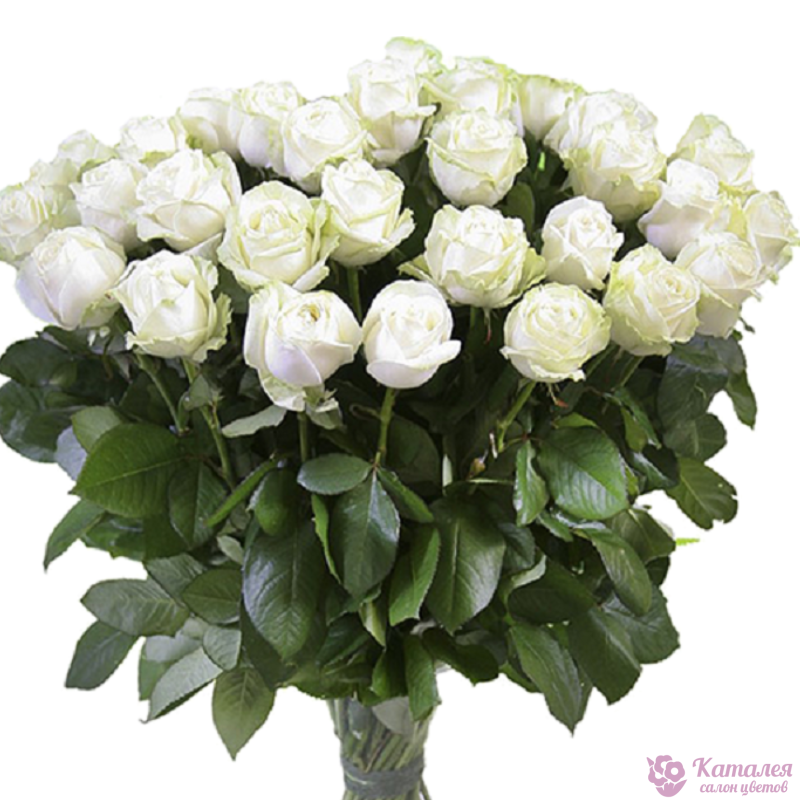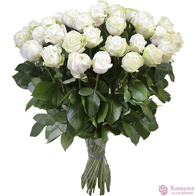 Букет состоит из 31 белая роза, прозрачная упаковка, атласная лента.