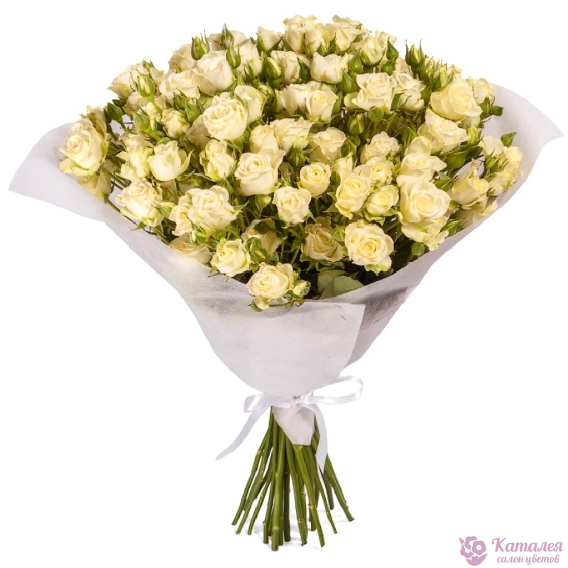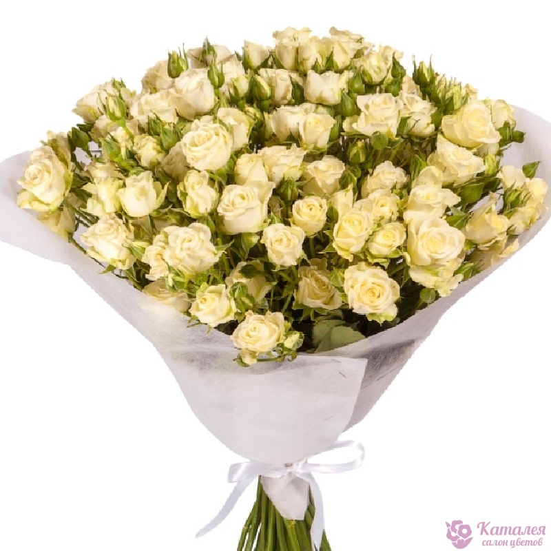 Букет состоит из 19 белых кустовых роз, красивая упаковка, атласная лента.
