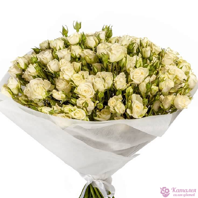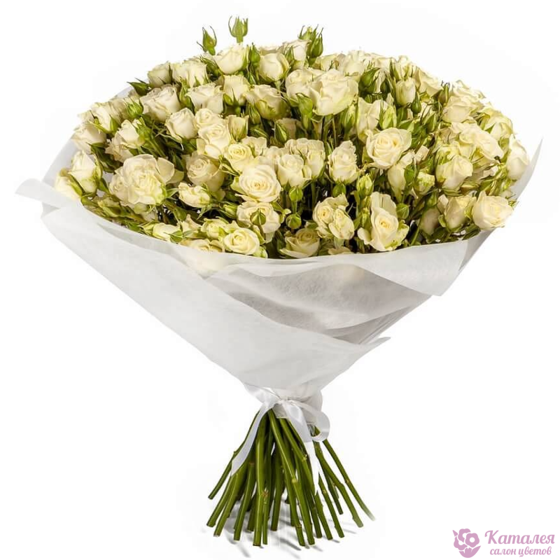 Букет состоит из 31 белая кустовая роза, фетр, атласная лента.