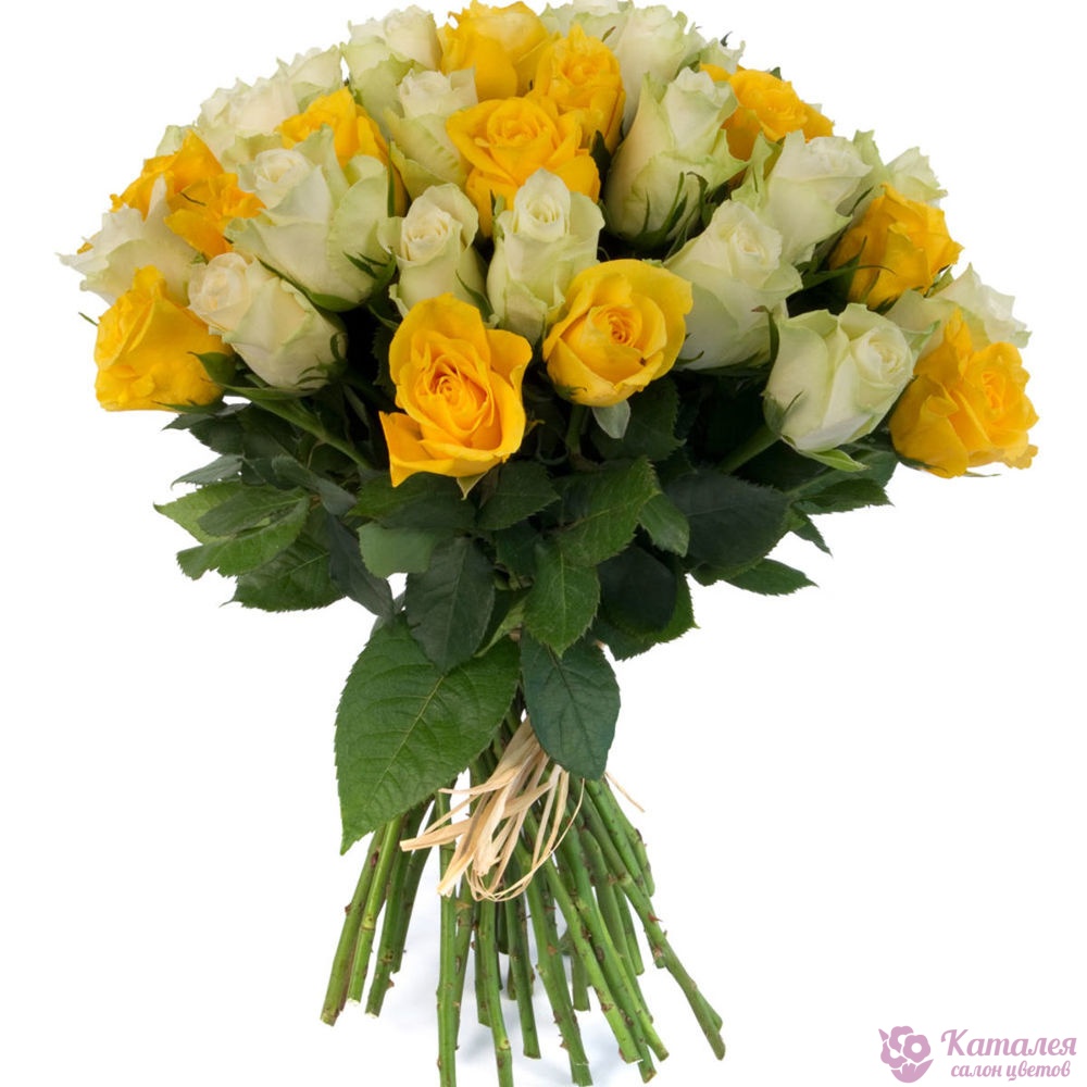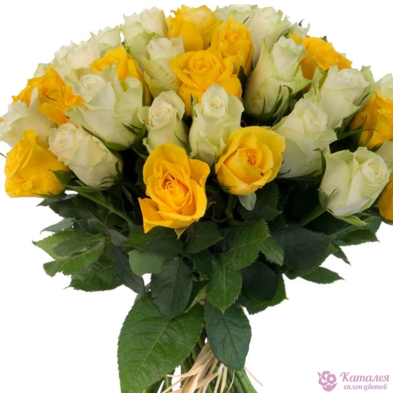 Букет состоит из 23 желтые розы, 22 белые розы, прозрачная упаковка, атласная лента.