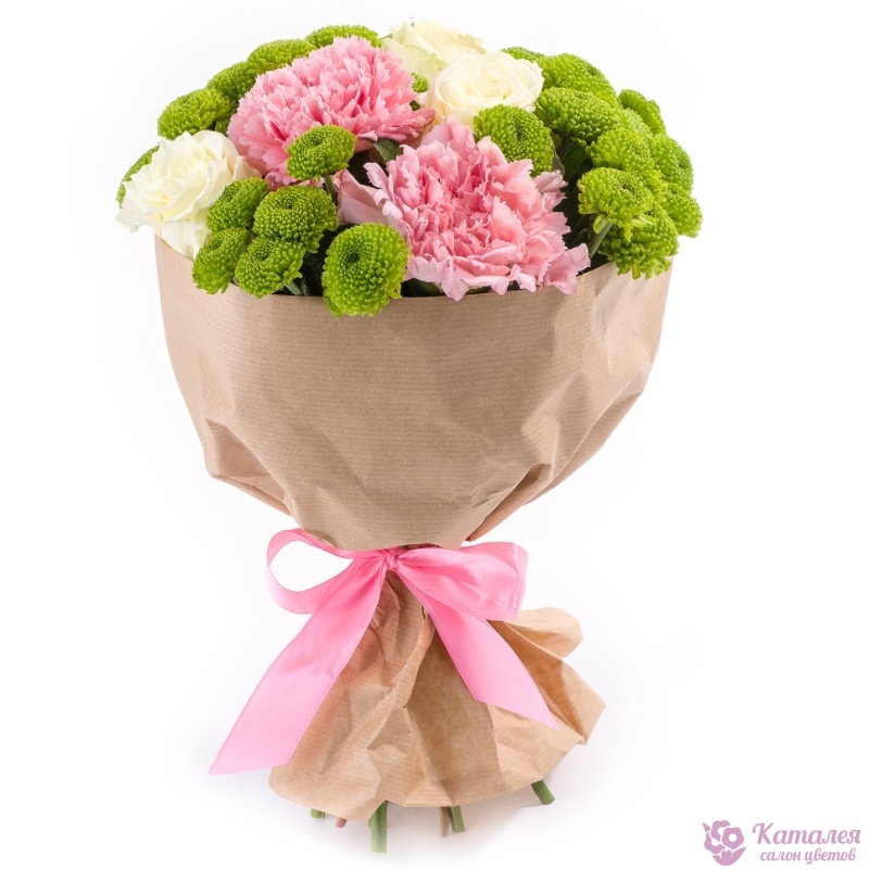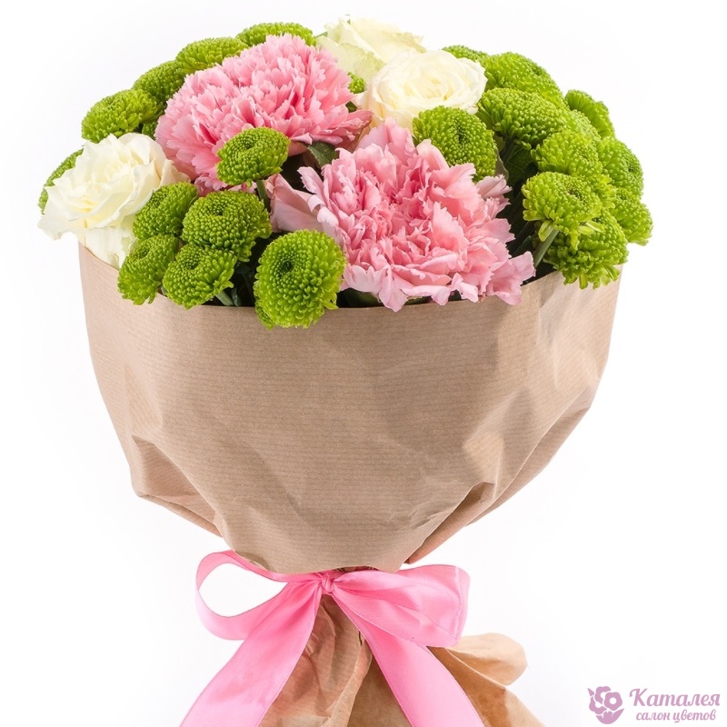Букет состоит из 3 гвоздики, 3 розы, 3 ветки хризантемы, крафт, атласная лента.