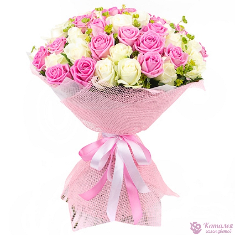 Букет состоит из 26 розовых роз, 25 белых роз, зелень, красивая упаковка, атласная лента.