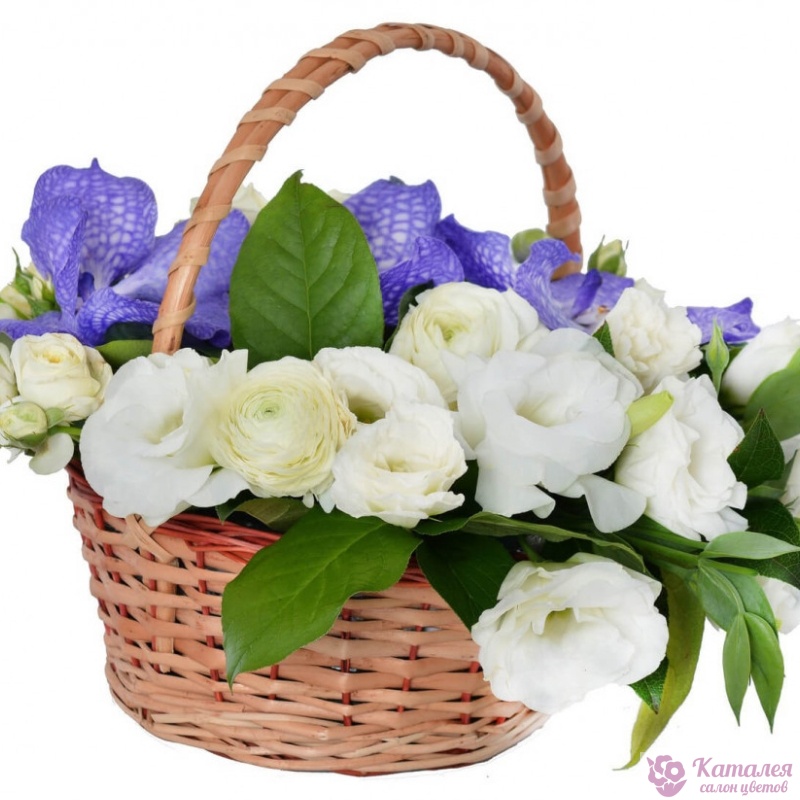 Букет состоит из 7 веток кустовой розы, 7 веток эустомы, 3 орхидеи, зелень, корзина, оазис.