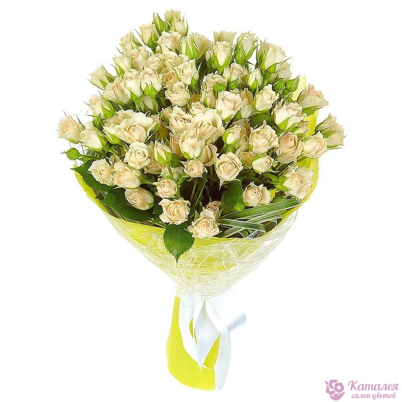 Букет состоит из 11 белых кустовых роз, зелень, красивая упаковка, атласная лента.