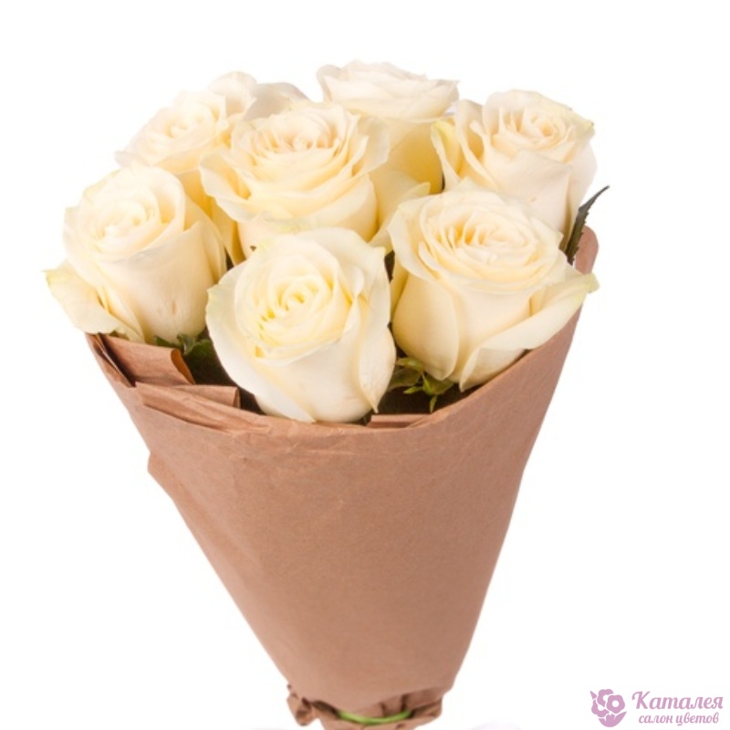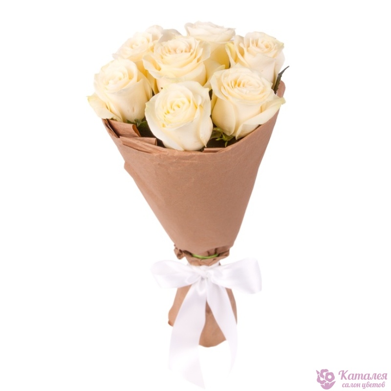 Букет состоит из 7 белых роз, крафт, атласная лента.